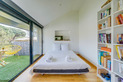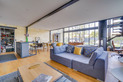 La maison s’ouvre sur une pièce de vie magistrale, sublimée par un mur de verre ouvrant sur l’extérieur, une grande hauteur sous plafond et un poêle suspendu, véritable pièce maîtresse du lieu.