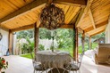 A l'extérieur, le terrain paysagé de 900m² environ invite à la détente avec différents espaces proposant un bassin d'agrément à carpes, une pergola pour les repas d'été, une terrasse avec un salon et cette magnifique varangue au style balinais parfaite pour les moments de repos à l'ombre ou les belles soirées d'été.